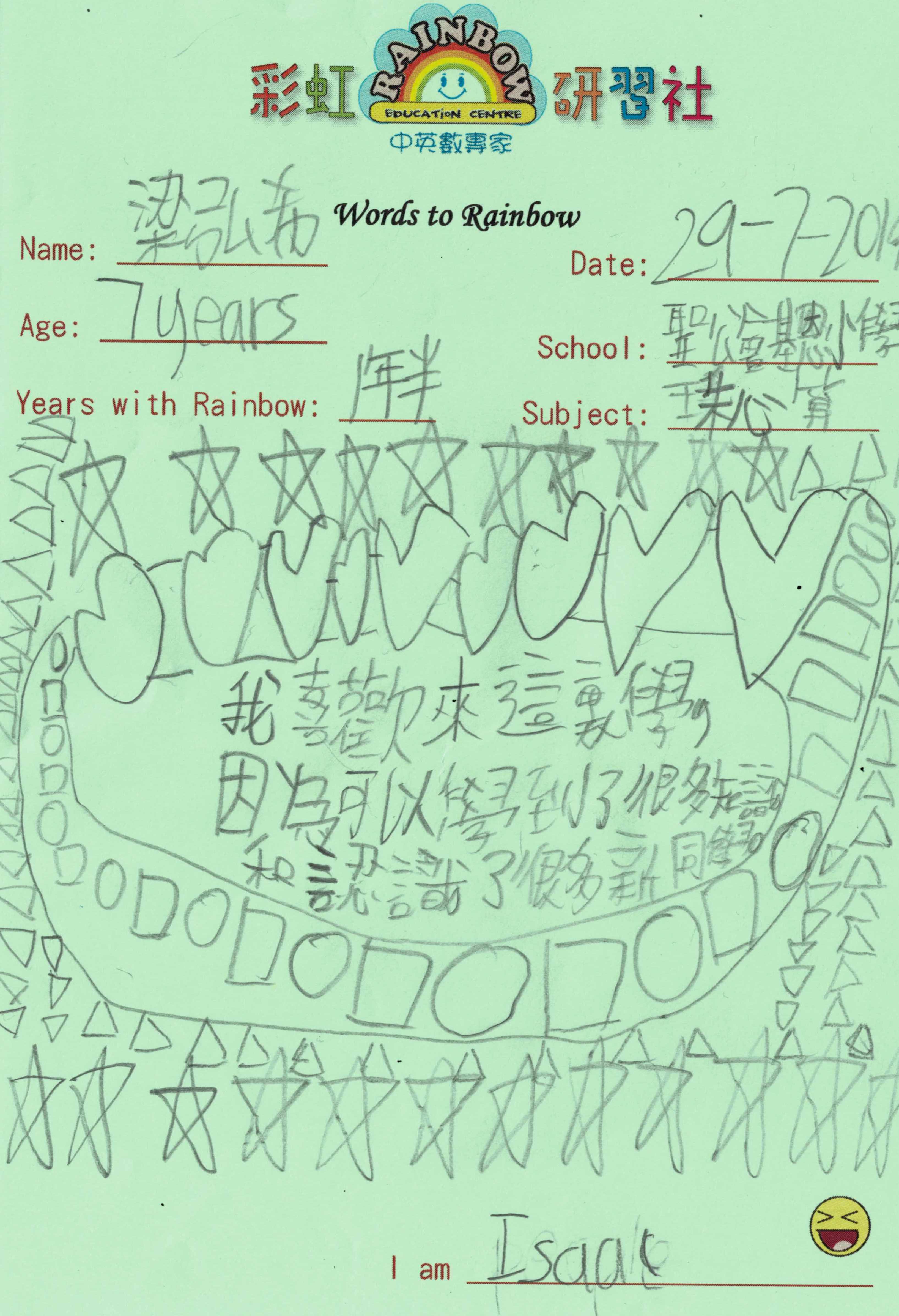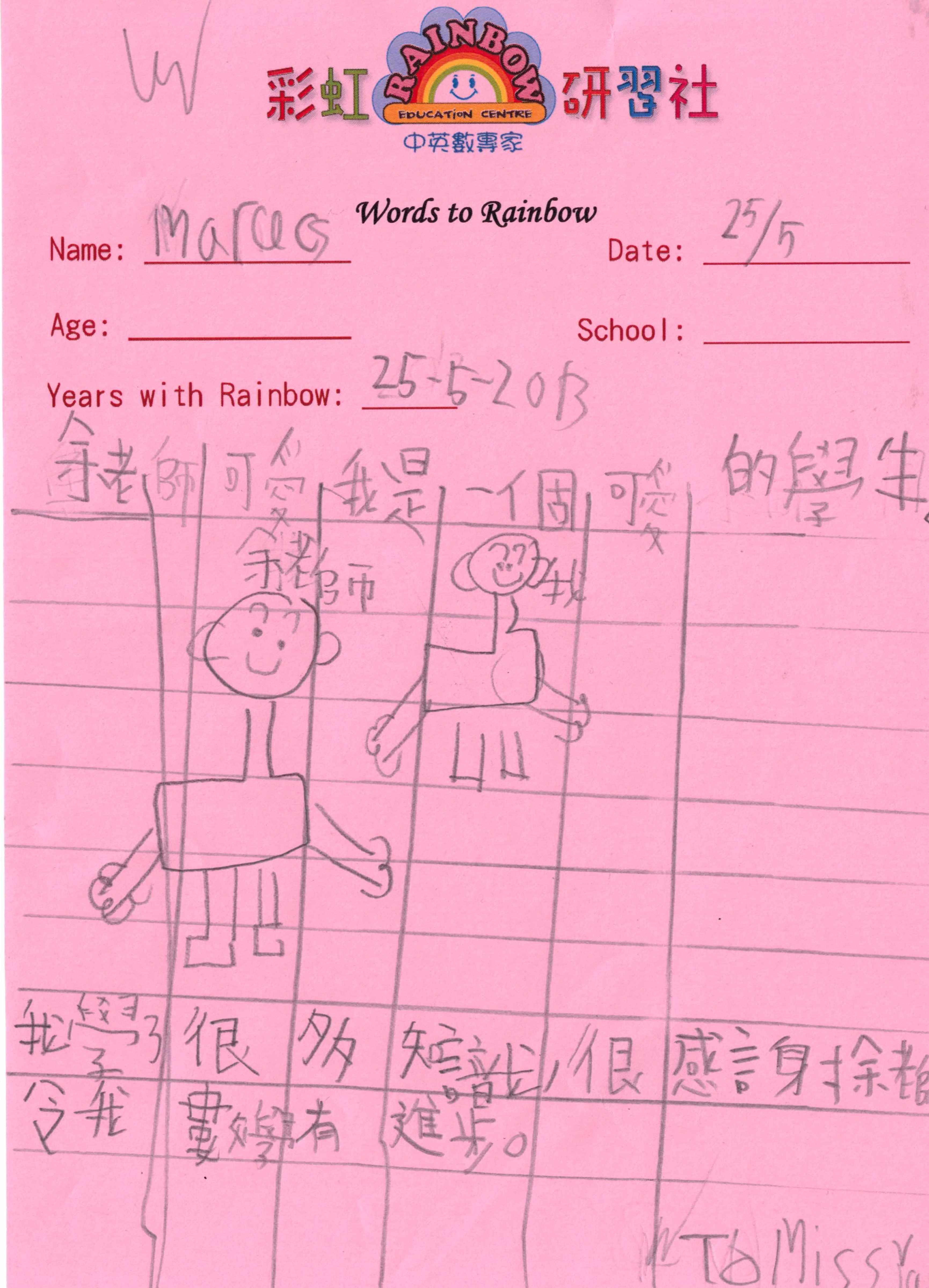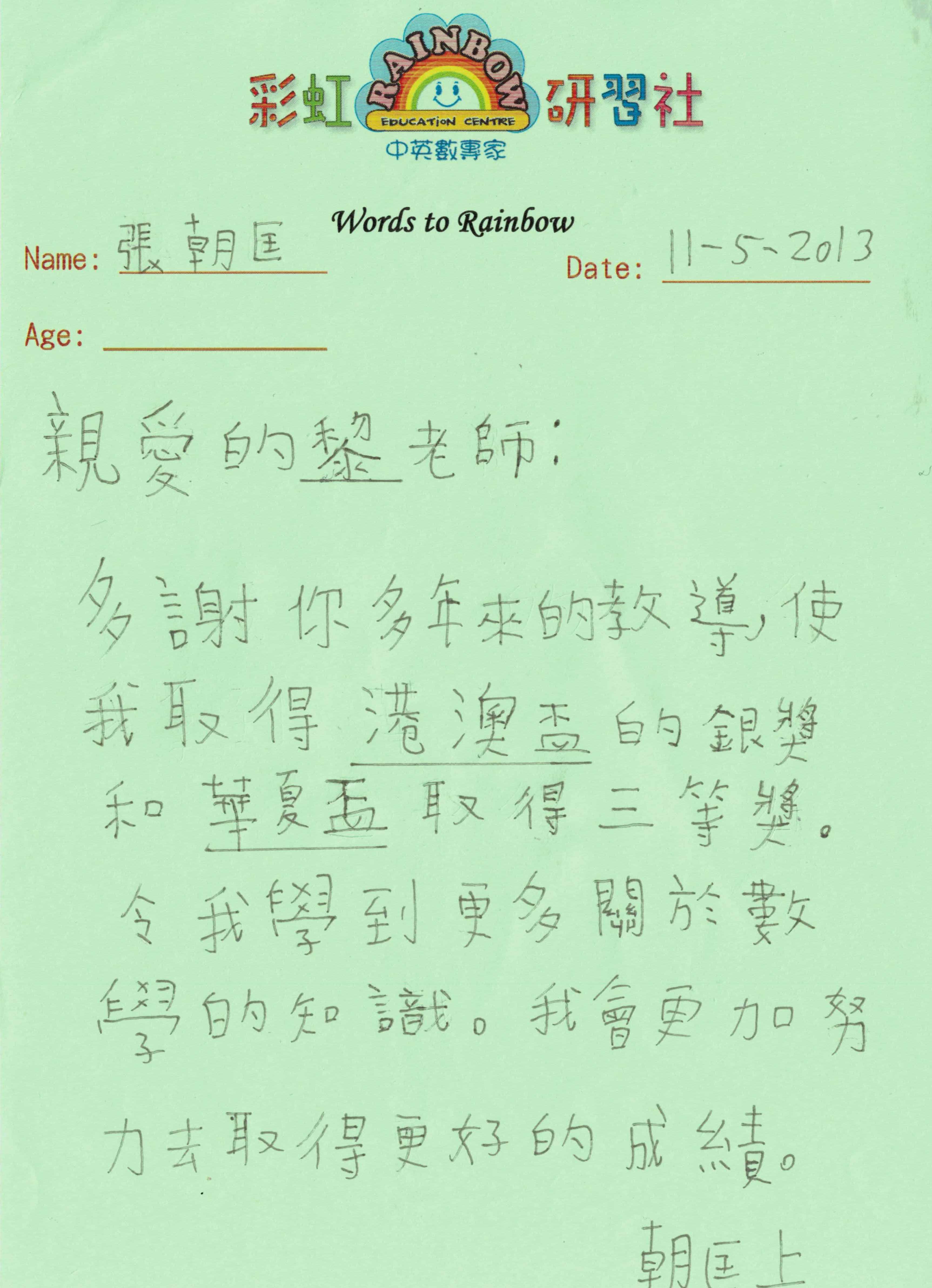 “自多年前從事兒童教育服務界開始,轉眼已10多個年頭了。默默地盡心教導每一位小朋友,看著他們茁壯成長。從幼兒到小童,從小童到中學生,在這個漫長的歲月中,大部份的小朋友在學業上,不知不覺地進步;在學校裡,成績躍飛,名列前茅;在彩虹,我們真摯的友誼在不知不覺間建立起來,牢不可破,亦師亦友。看著他們成長和進步,我感觸良多,他們也成為了我不斷求進和精益求精的動力。”